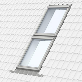 Twee identieke VELUX dakramen voorzien van een gootstuk EDW .. 0000 en een 100 mm koppelgootstuk EKW .. 0007.